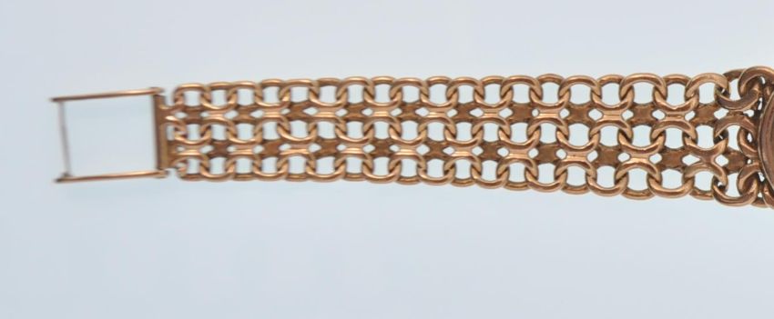 A vintage 20th century 9ct gold Omega Genève wristwatch with 9ct gold chain linked strap. Gold dial with roman numeral batons.  26.9g Weight.