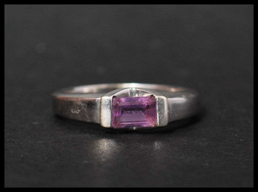 A hallmarked 9ct white gold and amethyst contemporary ring having a suspension set baguette amethyst. Hallmarked London. Weight 2.8g. Size P.