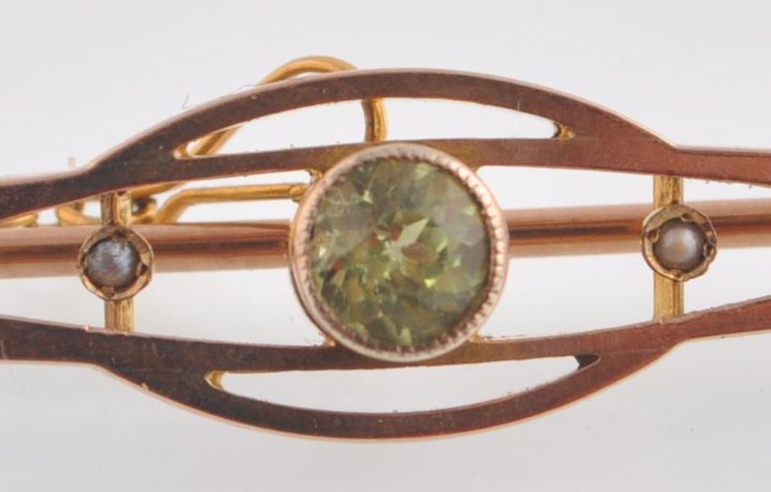 A 9ct gold Art Nouveau ladies bar brooch having a central round cut peridot stone flanked by small seed pearls. Pin verso complete with safety chain. Total weight 3.73g / Length 5cms