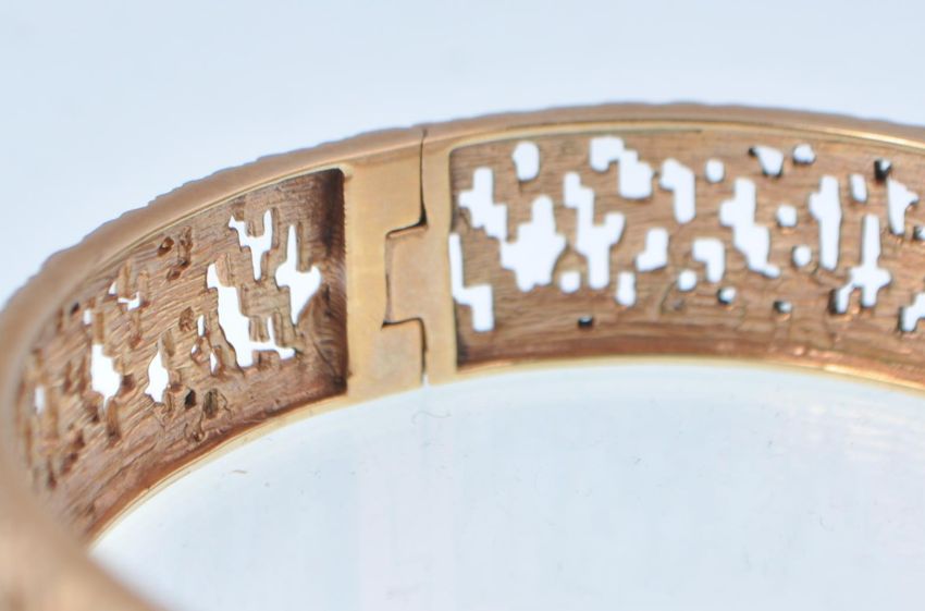 A hallmarked 9ct gold bangle bracelet having bark effect design with fretwork piercing throughout. Hidden clasp to side with fold over catch. Bears London import hallmarks Measures 7cm wide. Weighs 27.6 grams