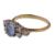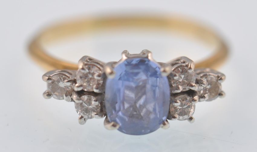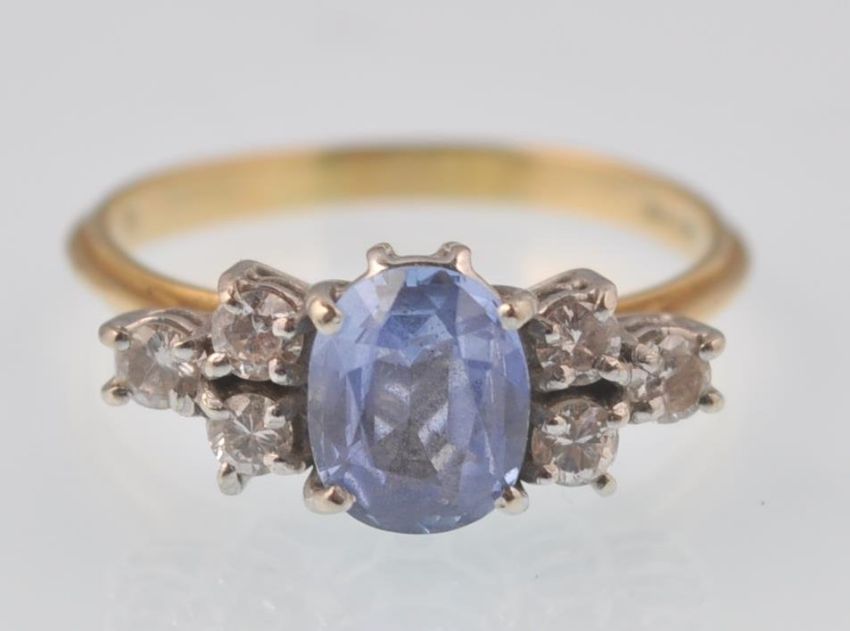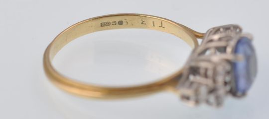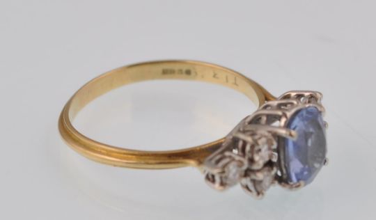 An 18ct gold / 750 marked diamond and blue stone ladies ring, the central blue stone with faced cuts and diamonds to the shoulders. Size Q.5, total weight 3.65g