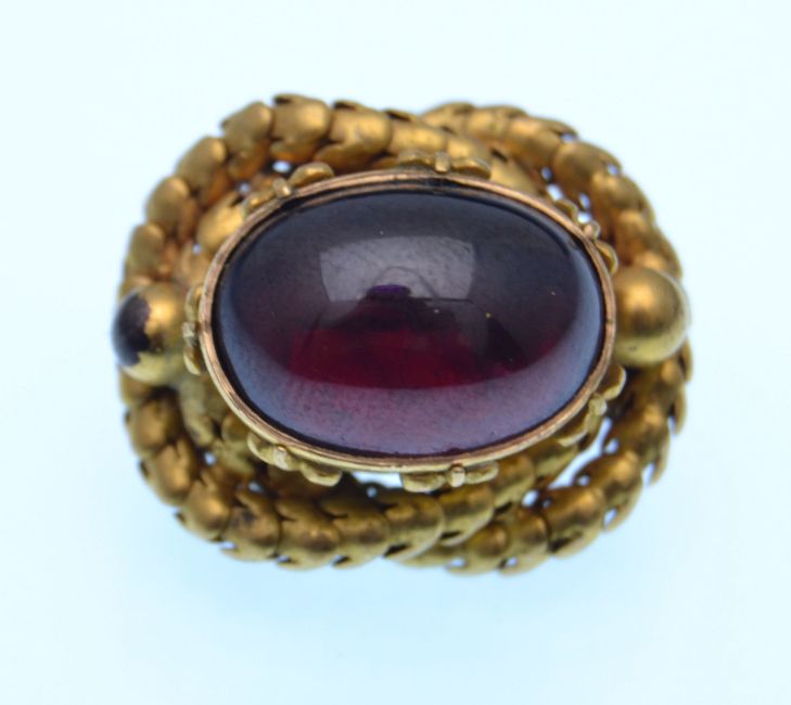An 18ct gold mid Victorian garnet cabochon brooch. The garnet being collet set within a Brazilian snake link mount. Total weight approx 8.4g. Measures 1 1/2 inches.