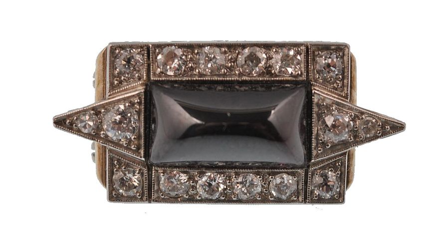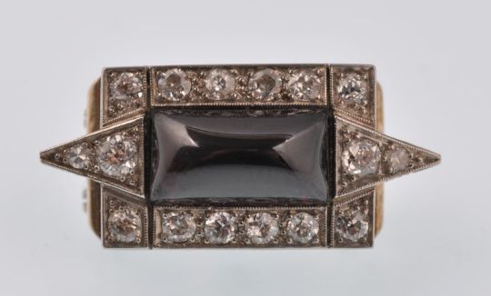 An early 20th century gold and diamond brooch. The brooch having a large central red stone cabochon surrounded by old cut diamonds, completed with roller clasp. Total weight 9.8g. Estimated diamond weight 0.80cts Measures approx 1.2 inches.