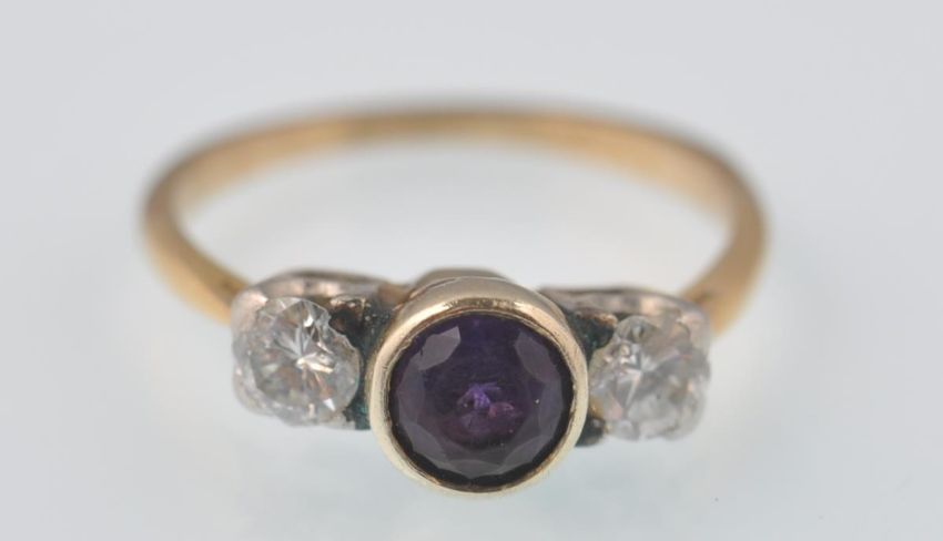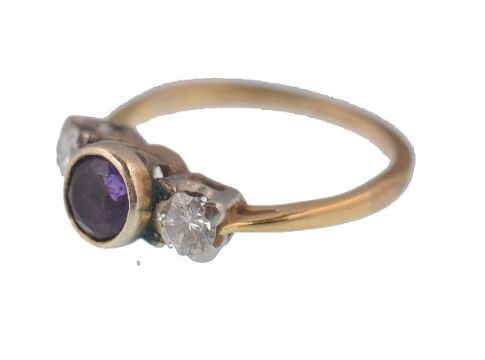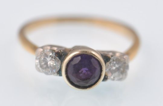An 18ct gold ladies amethyst and diamond 3 stone ring.  The ring having a 5mm central amethyst in rub over setting flanked by two diamonds approx 0.10 cts each. Total weight 2.21g .  Size G.