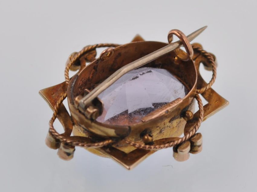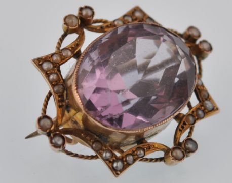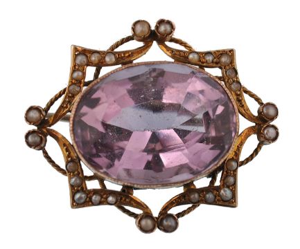 A Victorian 9ct ( stamped) gold and amethyst seed pearl ladies brooch. The large facet cut oval amethyst being set within a halo of seed pearls. Pin verso. Measures 3cms long  / weight 7.03g