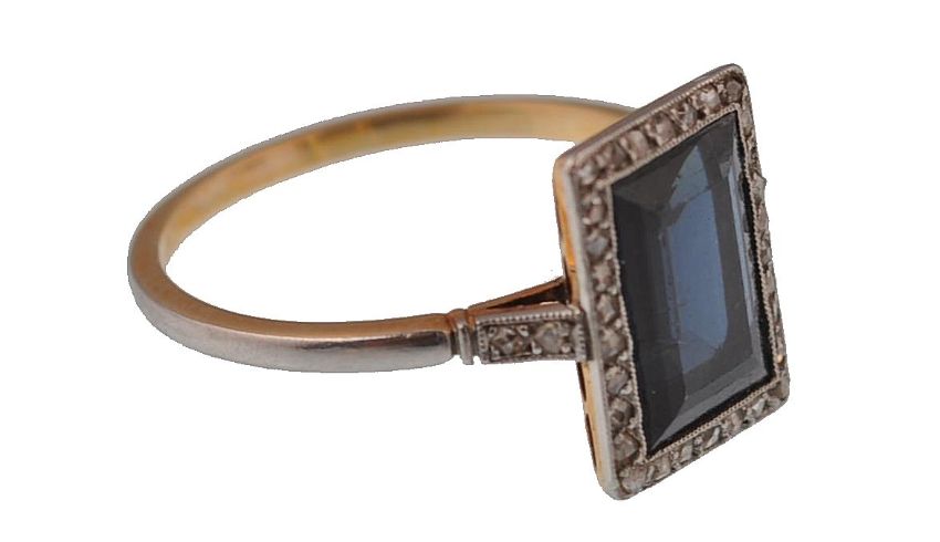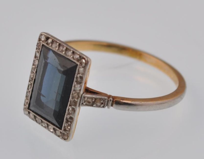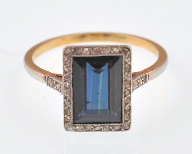 A 1920's 18ct gold French Art Deco sapphire and diamond ring. The ring being set with a step cut blue sapphire, surrounded by rose cut diamonds in an openwork lattice setting, having rose cut diamond accent shoulders and a platinum washed shank. French Eagle mark to outside of shank. Sapphire measures approx 9.5mm x 6.5mm x 3.3mm. Total weight 2.7g.   Size N.