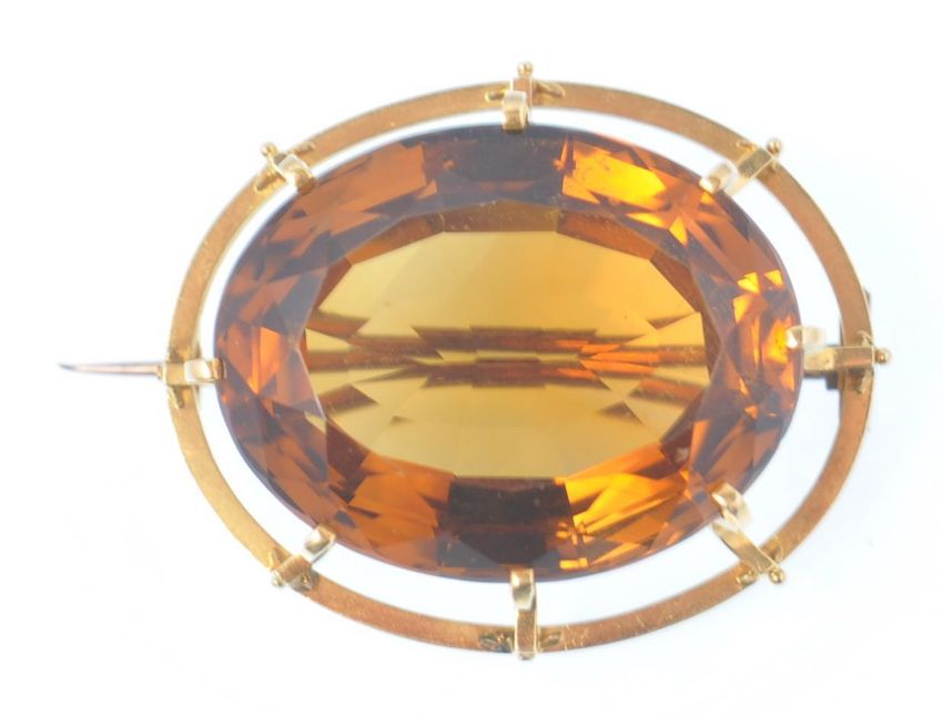 A large Victorian facet cut citrine and gold brooch. The citrine in 8 prong setting with open work frame, pin verso and pendant bale. Weight 20.7g