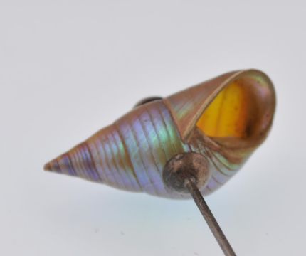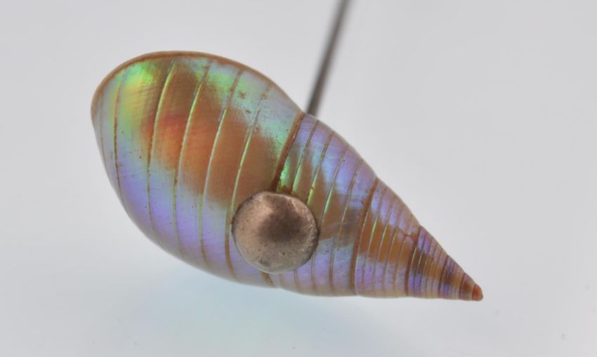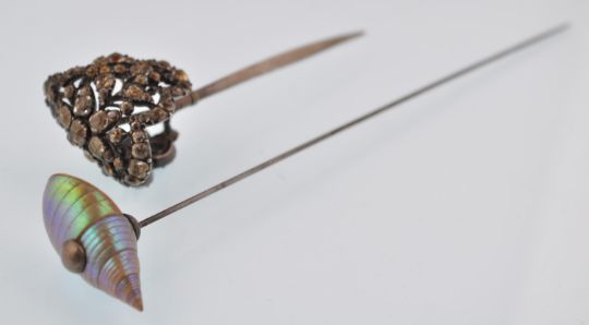An early 20th century hat pin and hair stick pin. The hat pin completed with a shell finial, the hair pin having old cut paste embellishments with screw fitting. Measures:- hat pin approx 6 inches, hairpin approx 3 1/2 inches.