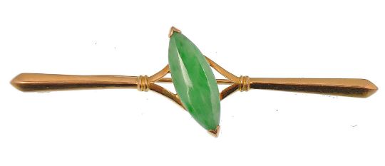 A Chinese yellow gold and jade bar brooch with central Jade navette cabochon to centre with c-clasp pin verso. Chinese markings verso.  Measures 2 1/4" long / Weight 2.9g