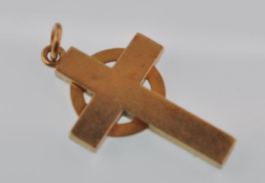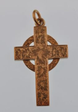 A Victorian 15ct gold Celtic Sun Cross / Halo of Jesus cross necklace pendant being chase decorated, stamped 15ct with bale atop. Measures 3cms long  / weight 3.13g