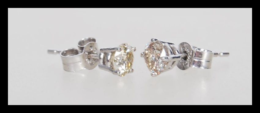 A pair of stamped 14ct white gold stud earrings prong set with brilliant cut diamonds. Diamonds estimated at 4pts each. Weight 0.6g.