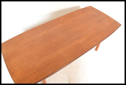 A retro vintage 20th century teak wood coffee table raised on tapering supports having rail magazine ruck underneath. Measures 38 cm high x 115 cm wide x 51 cm deep.