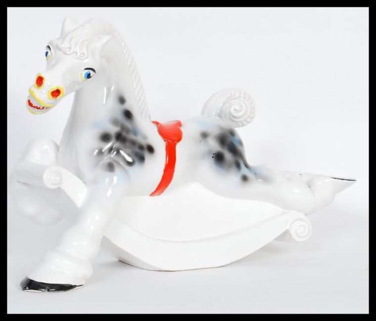 A vintage retro 20th Century ceramic carousel rocking horse figure ornament having a white ground with airbrushed black and blue colouring with hand painted yellow and orange details. Signed to the base. Measures 26 cm high x 39 cm wide.