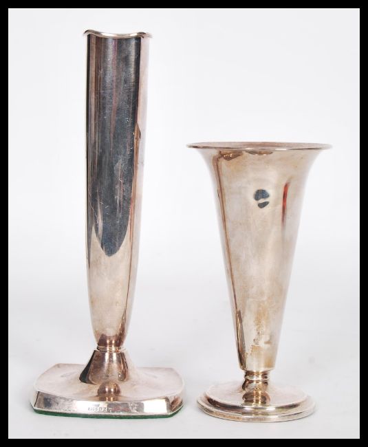 Two vintage 20th Century continental silver 830s solifleur candlesticks one raised on square base with tall column and the other of trumpet form raised on stepped circular base. Weighs 186 grams. Tallest measures 15cm high.