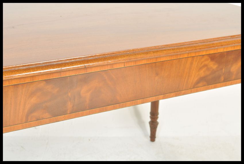 A good quality Georgian revival mahogany and crossbanded inlaid centre table. Raised on turned, tapering legs with inlaid, crossbanded frieze with rectangular table top above. Measures 77cm high x 137cm width x 76cm deep.