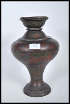 A 19th Century Indian brass vase having engraved and painted scenes in banded sections with panels of narrative scenes with floral sprays and fish, being raised on a round footed base.Measures 32cm high.