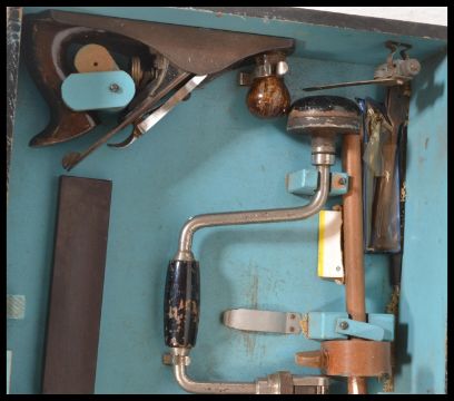A vintage mid 20th Century 1950's ebonised wood working work box, the hinged lid opening to reveal a fully appointed interior finished in blue, with various wood working tools, to include chisels, saws, Stanley No. 4 wood plane, hammers and much more.