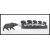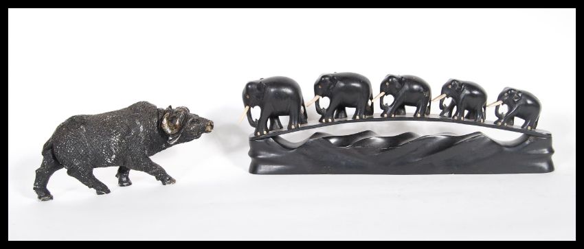 A 20th Century soapstone figure of a water buffalo in a standing position, together with a ebony figure depicting five graduating elephants having bone tusks.Measures 40cm wide.