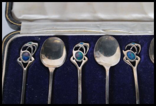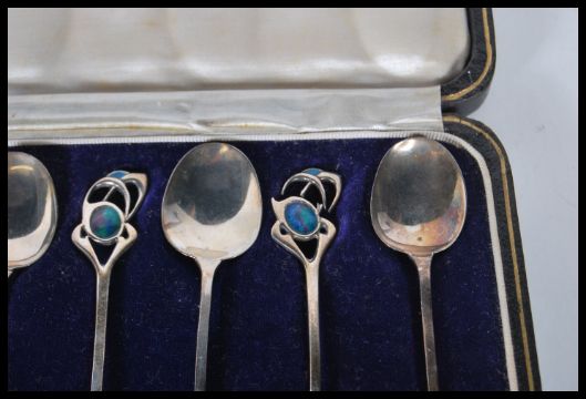 A set of six early 20th Century Arts and Crafts Cymric teaspoons by Liberty and Co designed by Archibald Knox having blue enamelled and openwork finials. Hallmarked Birmingham 1901. Set within original box.