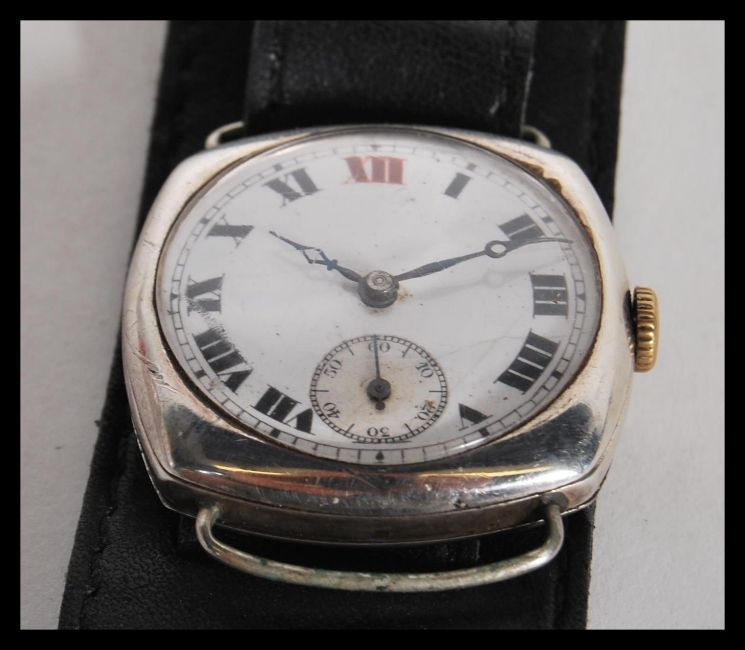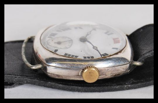 A selection of vintage 1920's watches to include a continental silver watch having a white enamelled face with roman numerals to the chapter ring with a subsidiary dial (hallmarked 1926), a silver case watch with white enamelled face and subsidiary dial (hallmarked 1928) and a Services Winchester stainless steel cased watch. All on leather straps.