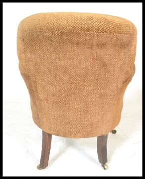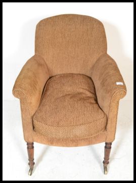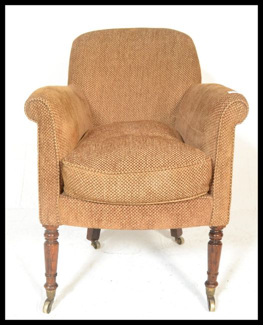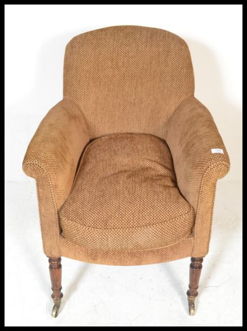 A Victorian style oak and woollen upholstered bedroom armchair. Raised on turned oak legs with brass cap castors having a tub shaped frame seat with woollen contemporary upholstery