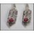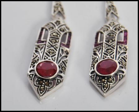 A pair of silver Art Deco style drop earrings of lozenge shape form, set with ruby stones and marcasite, having pierced decoration. Drops measure 6cm. Weighs 8.6g.