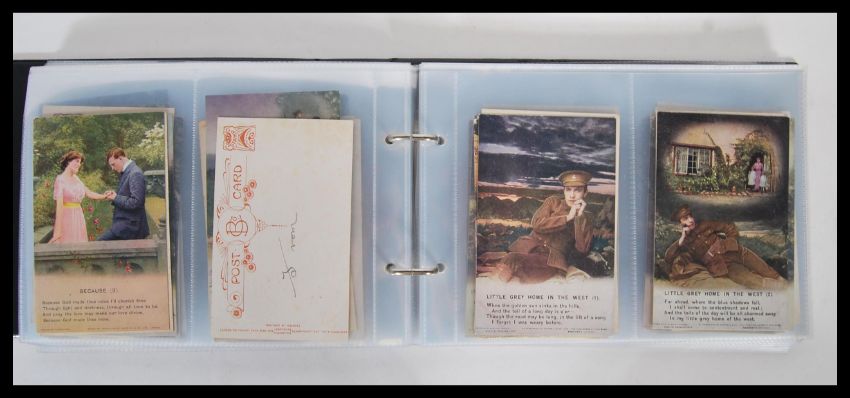 A collection of antique WWl sweetheart postcards to include, the trail of the lonesome pine, only for you, skylark, A little bit of heaven, god send you back to me, the anchor's weighed, smoke clouds, my hero and many more. All contained within an album, approx 108 in total.