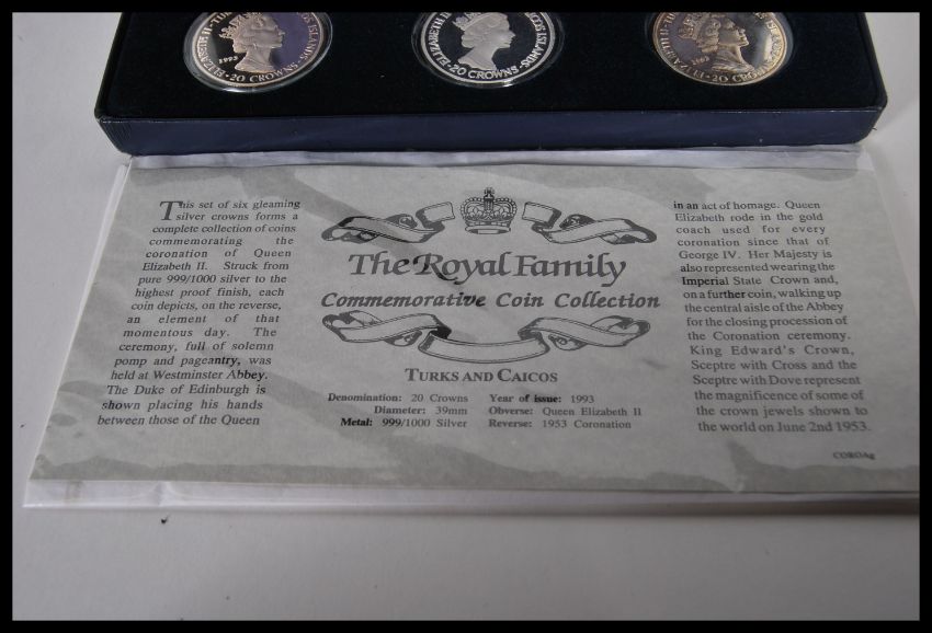 A collection of six silver 1993 Queen Elizabeth II coronation anniversary commemorative crowns set within a presentation box.