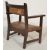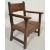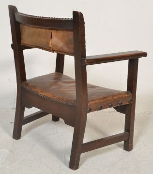 An early 20th Century Art Deco open framed childs fireside armchair, the oak frame upholstered in tan leather to the seat pad and backrest with brass studded detail.