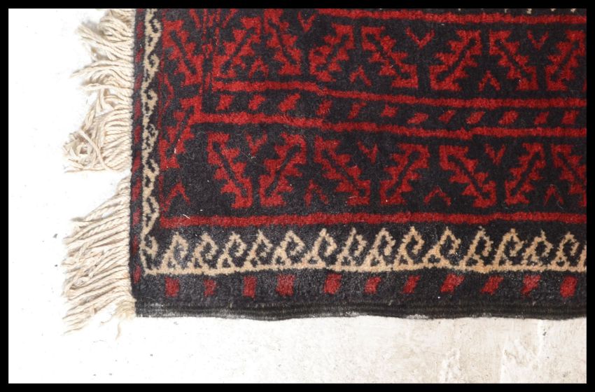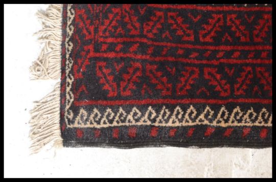 A 20th Century Persian / Islamic carpet floor rug / runner, having a red ground with medallions to central panel and geometric borders all with tasseled ends. Measures 270cm high x 122cm wide.