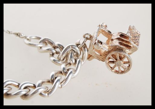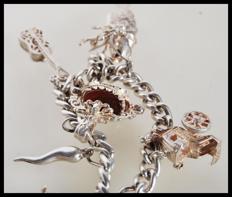 A silver hallmarked heart lock charm bracelet having seven charms including an articulated fish, a guitar, a carriage with articulated wheels, a hedgehog with a red stone belly, a set of keys, a fob pendant set with three polished stones etc. Hallmarked London 1977. Weight 54g.