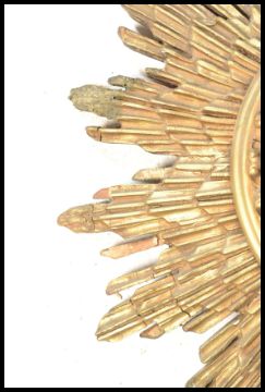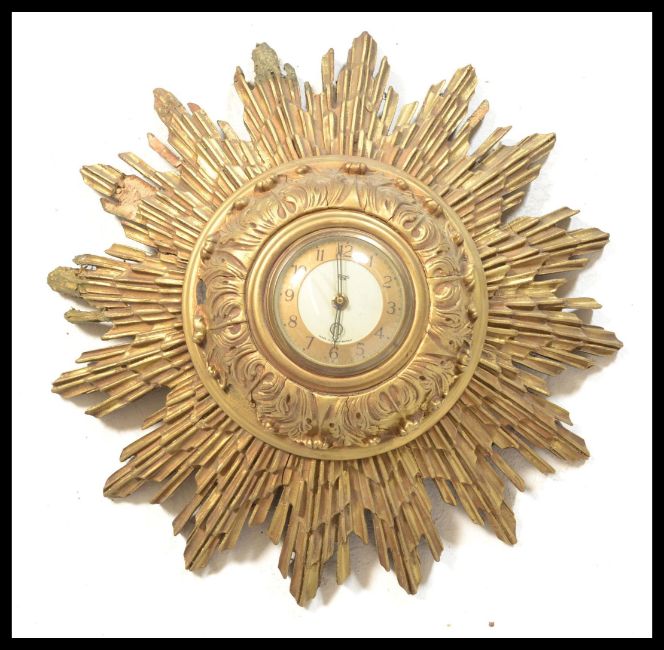 A vintage retro 20th Century Smiths sunburst / starburst wall clock having a central circular dial having a gilt wooden frame. Measures 43 cm diameter.