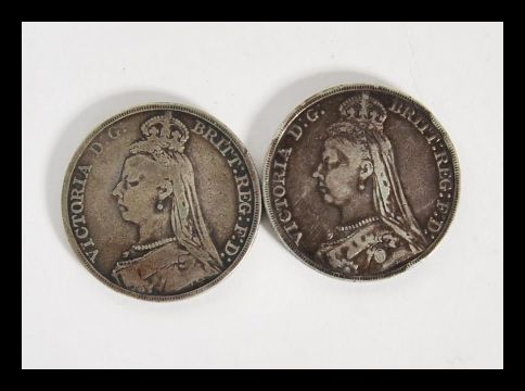 Two 19th Century Victorian silver crown coins consisting of a 1892 example and a 1891 example.