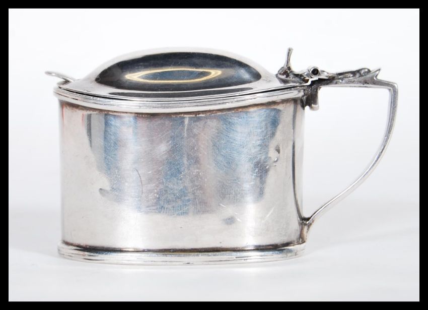 An early 20th Century Edwardian silver hallmarked mustard pot of ovular form having a shaped handle and a hinged lid still retaining a blue glass liner and condiment spoon. Hallmarked Birmingham 1907.