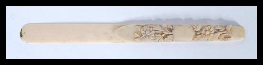 A 19th Century carved ivory page turner bookmark having carved floral decoration and an unmarked armorial cartouche panel.Measures 18cm wide.