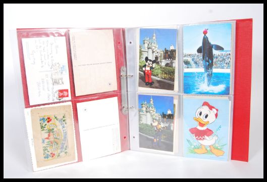 A album of early 20th Century and later postcards to include, silk cards related to war, souvenir, good luck and others. Together with later postcards, Disneyland and other joke cards.