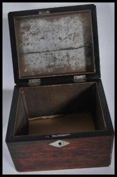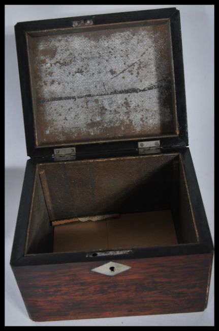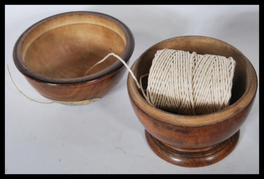 A Victorian treen worked ' Keepsake ' treen worked string spool of globular form having string inset together with a 19th century rosewood  tea caddy with inset top notation ' TEA' and sectional interior. Measures 11cm x 14cm x 12cm.