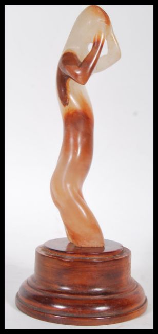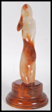 A 20th Century carved agate figure sculpture in the form of a nude female with raised arms on a turned wooden base.Measures 31cm high.