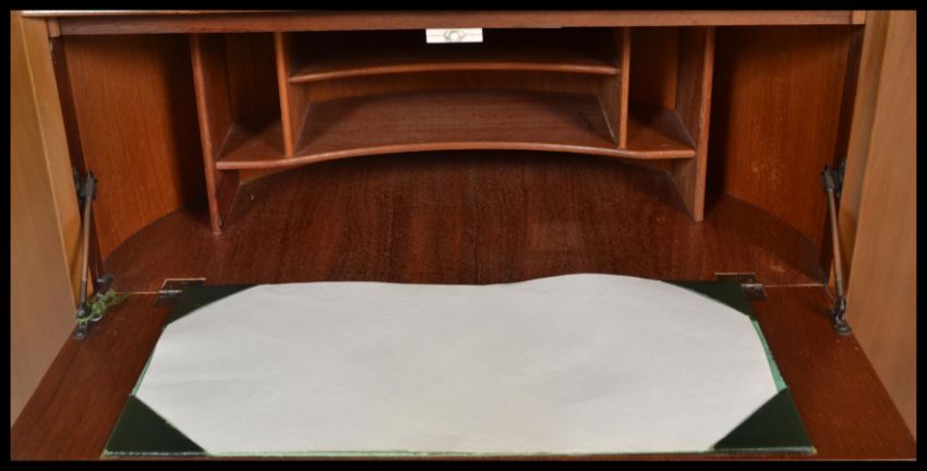A retro 20th Century Teak wood bureau / desk corner cabinet together with a vintage cocktail cabinet converted in to a record storage cabinet. Measures 145cm high x 81cm wide x 47cm depth
