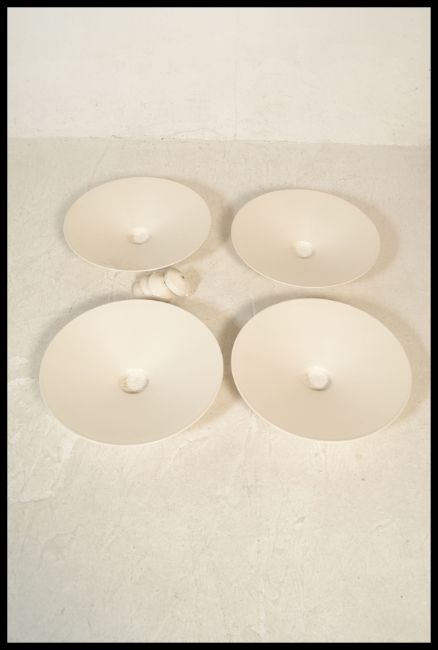 Light Shades - A group of four retro industrial factory style UFO form lampshades having white enamelled finish.