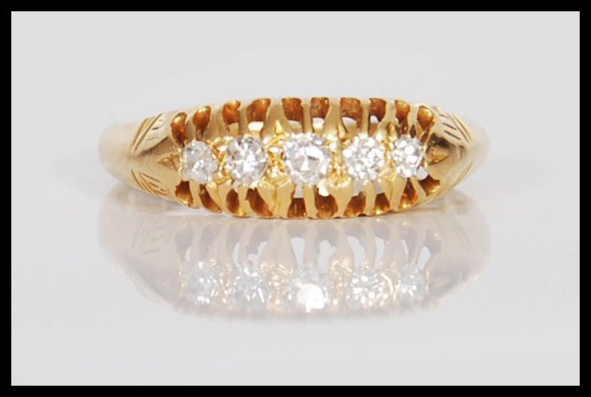 A hallmarked 18ct gold ladies ring set with five brilliant cut diamonds. Estimated diamond total 19pts. Weight 3.2g. Size O.5.