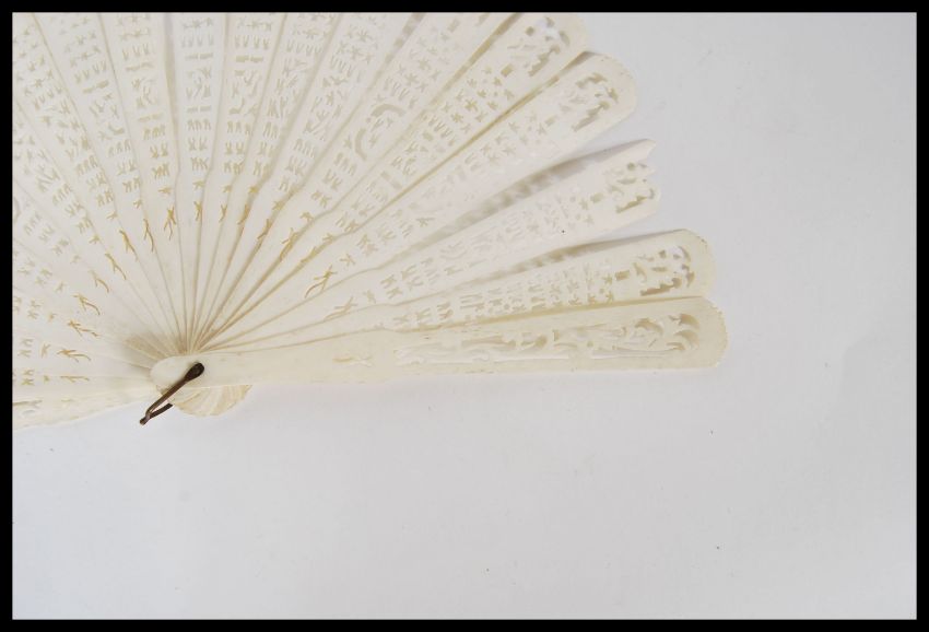An early 20th Century ivory fan having 20 carved panels with pierced decoration having a brass pin.Measures 20cm wide.