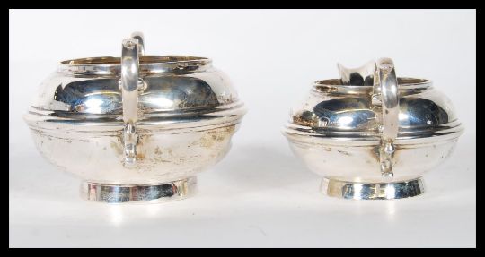A silver hallmarked William Neale creamer jug having a scrolled handle raised on a circular base along with a matching William Neale sugar bowl. Jug hallmarked Birmingham 1914, bowl hallmarked Chester 1913. Weight 182g.