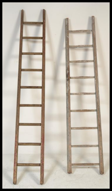 A pair of vintage mid 20th Century industrial wooden ladders, the ladders with turned steps each having wire supports. Measures 207cm high