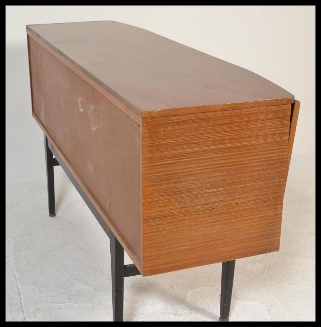 A vintage retro 1950's teak wood veneer sideboard credenza having a central bank of three drawers flanked by cupboards raised on ebonised shaped supports united by stretchers. Measures 80cm high x 151cm wide x 44cm depth