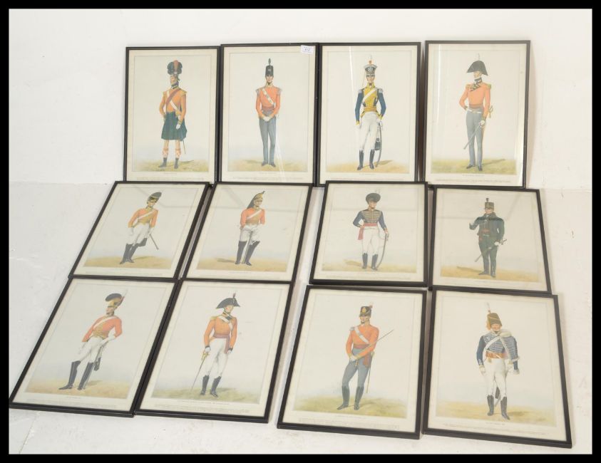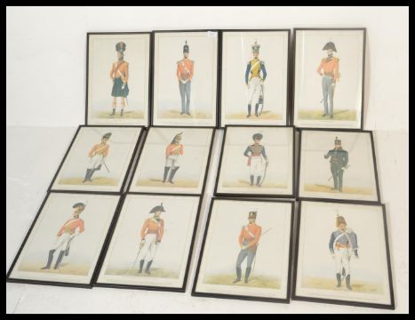 A collection of twelve different framed and glazed picture prints detailing military uniform from the 17th and 18th Century.