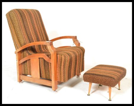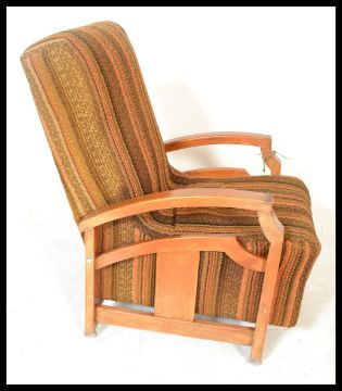 A vintage early 20th Century Art Deco Parker Knoll framed fireside armchair, shaped open open framed  rests with woollen upholstery, raised on shaped supports. Measures 85cm high x 60cm wide x 70cm depth