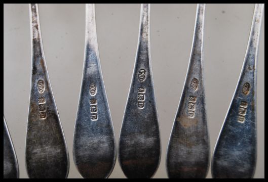 A matching set of early 20th Century silver hallmarked tea spoons. Hallmarked for Birmingham date letter D. Makers mark for Arthur Price & Co Ltd. Total weight 96.8g.