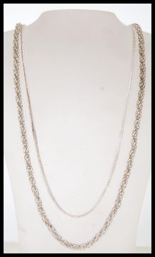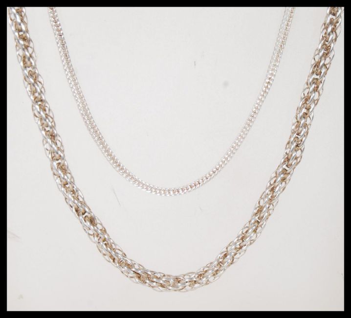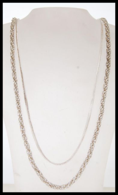 Two silver necklace chains to include a snake chain with an S clasp and a rope link necklace. Both measure 26 inches. Total weight 53.5g.