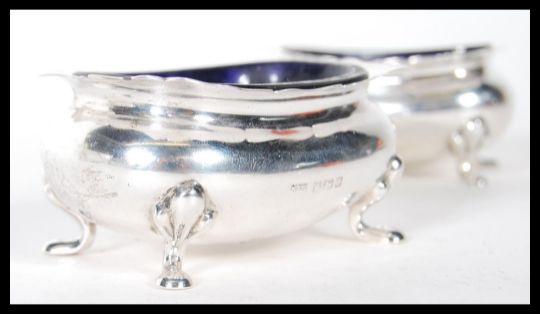 A pair of silver hallmarked Brook & Sons of Edinburgh blue glass lined table salts, all raised on paw feet. Marked for Brook & Son Edinburgh with Sheffield assay mark and date letter. Total weight excluding liners. Weight 92.35g